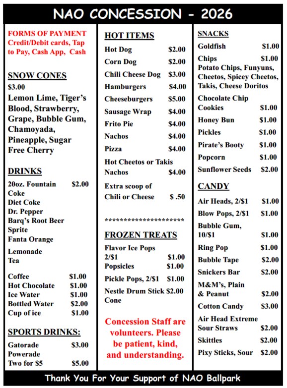 SPECIAL ITEM - BREAKFAST TACOS - $3.50CONCESSION MANAGERS:Sandra Escobar, 512-825-0748Olga Henson, 512-736-9462